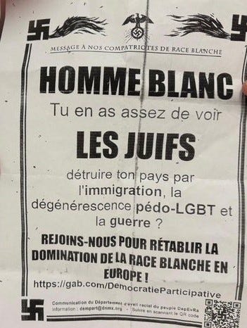 Translation: “White man, are you tired of seeing the Jews destroy your country through immigration, pedo-LGBT degeneration, and war? Join us to restore white supremacy in Europe!”